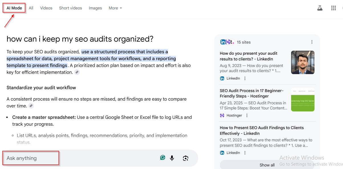 Traditionally, SEO research meant opening multiple tabs, comparing recommendations, and manually cross-checking data. AI Mode replaces that with a dialogue. You can ask a question, refine it, and keep building context within a single session.