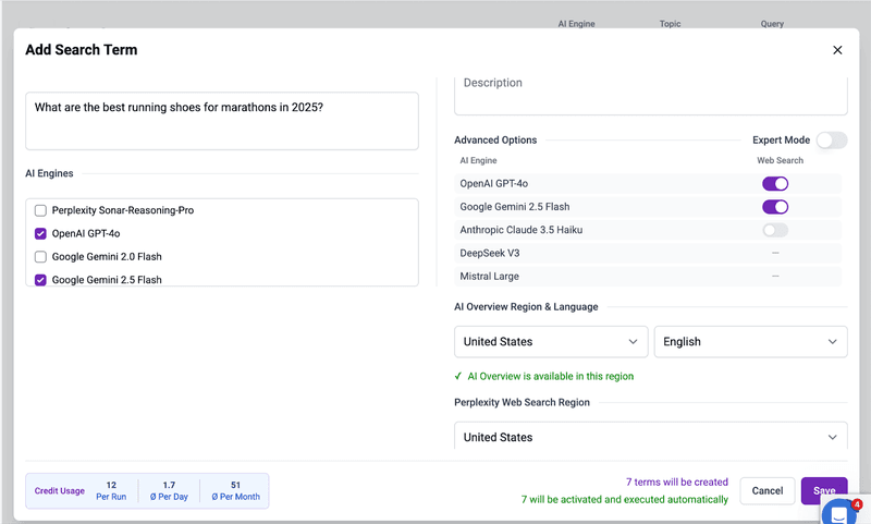 Inside Keyword.com, go to the “Search Terms” tab and add the AI search queries you want to track. Then choose which AI engines you want to monitor: ChatGPT, Perplexity Sonar, Gemini, and others.