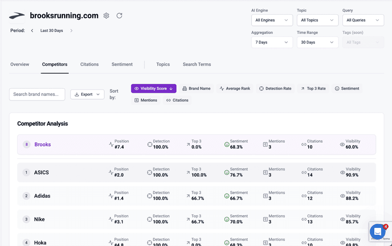 - Their visibility scores, sentiment ratings, and citation counts