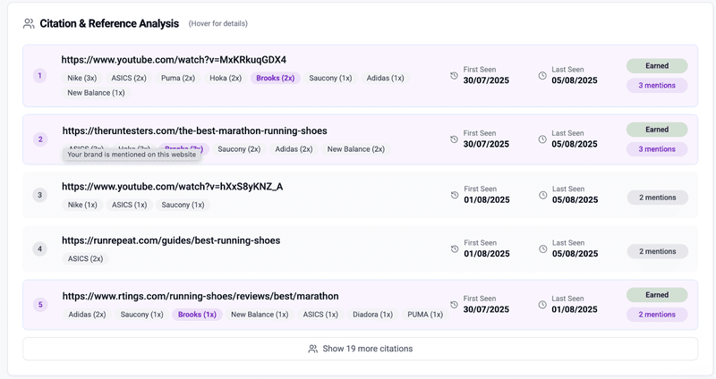 Also, pay attention to how frequently your client’s brand is cited as a source. High-frequency mentions and citations signal strong topical relevance and authority.
